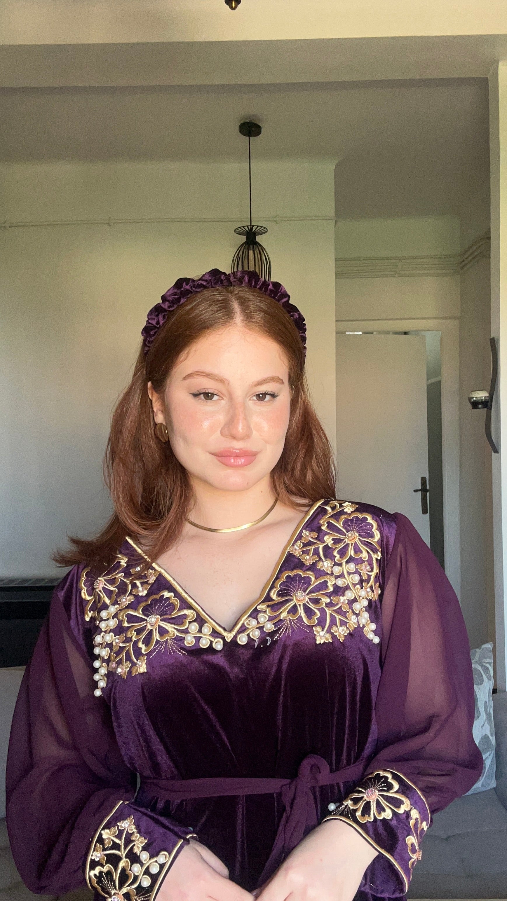 ✨ جبة فاخرة من القطيفة الرفيعة، مزينة بتطريز أنيق يبرز جمالها ولمستها التقليدية.